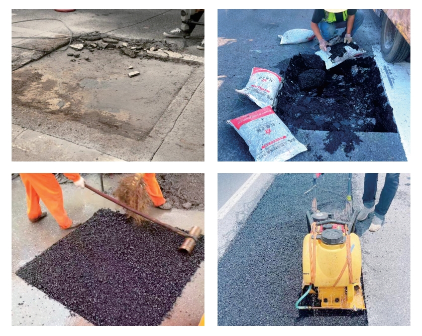 第二步:在坑槽内填入适量冷补料,若坑槽深度在8cm以上则需分层压实,根据压实程度决定填料的虚铺高度,一般为1-2cm。
