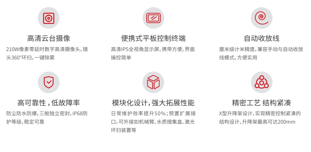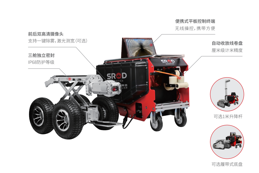 S190DHD管道检测机器人采用前后数字高清摄像单元,配备便携式手持平板控制终端,辅助强力照明光源和高精度计米线缆卷收装置,可根据车体行进速度自动匹配收放线速度,收线过程自动排线。可进入管道内部进行视频录像、缺陷抓拍、记录缺陷位置信息及制作专业的管道检测报告。